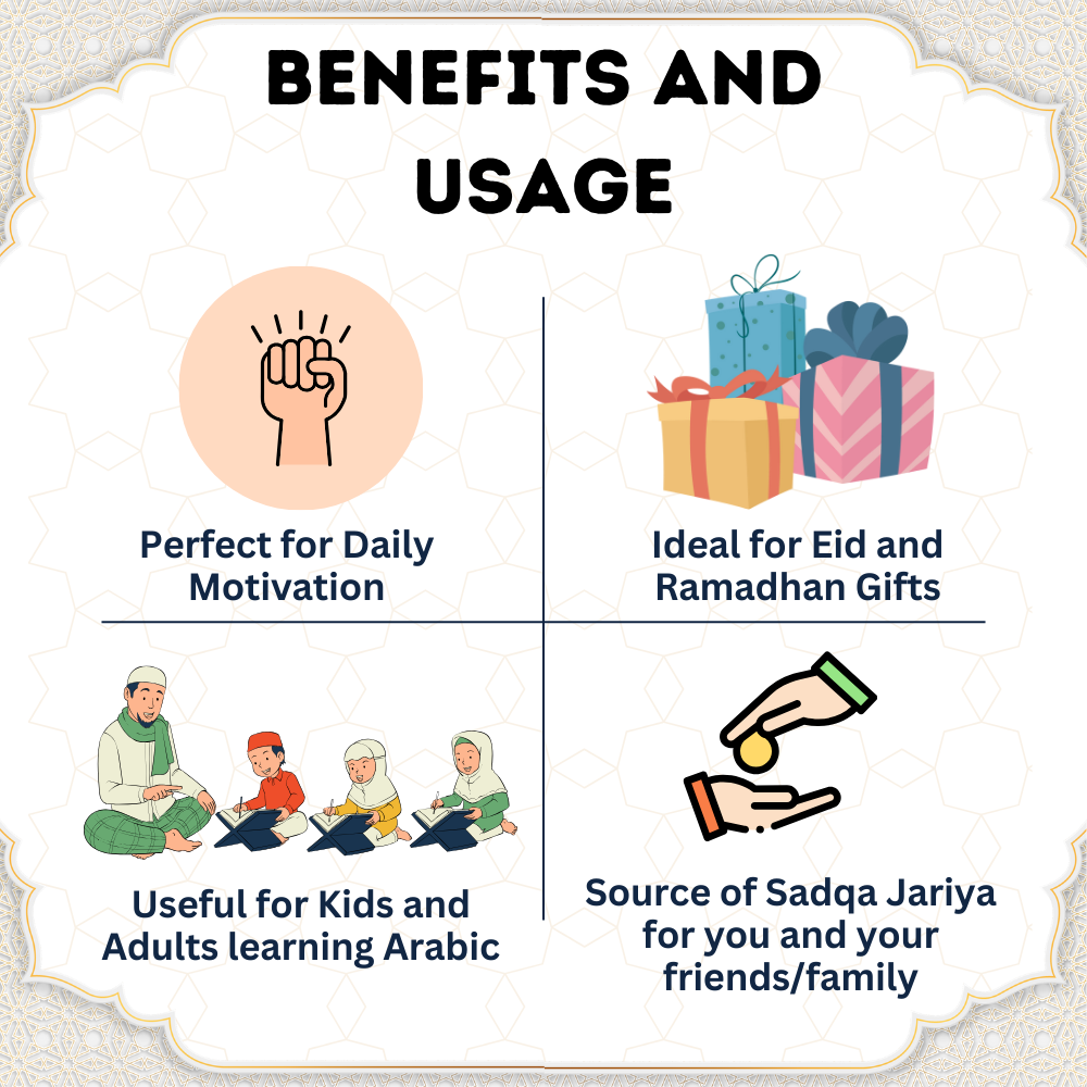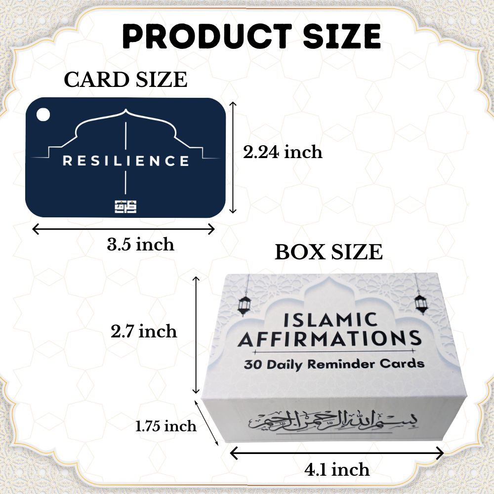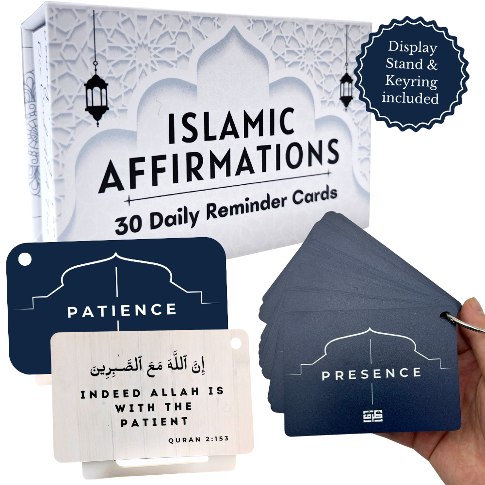 Elevate your spiritual journey with our 30 Islamic Affirmation Cards, thoughtfully designed to bring positivity and inspiration into your daily life. Each card is crafted with care and printed on premium 600gsm paper for sturdiness and durability, ensuring that they will withstand the test of time. Key Features: - 30 Inspirational Islamic Affirmation Cards - High-Quality 600gsm Paper for Durability - Magnetic Box for Easy Storage and Organization - Metal Ring for Convenient Card Handling - Display Stand Included for Showcase - Perfect Size to Carry in Your Purse/Wallet Whether you want to start your day with a powerful affirmation, reflect on your faith, or simply seek a moment of serenity, these cards are a wonderful addition to your routine. The magnetic box ensures that your cards are always neatly stored and easily accessible, while the included metal ring allows you to shuffle and select your affirmations effortlessly. The addition of a display stand makes it convenient to showcase your favorite card, turning your daily affirmation into a beautiful piece of decor in your home or office. These cards are also designed to be purse-friendly, so you can take them with you wherever you go, allowing you to find inspiration and strength whenever you need it. This set of 30 Islamic Affirmation Cards is a meaningful gift for yourself or a loved one, providing a source of motivation, hope, and spiritual connection. Order yours today and start each day with a positive affirmation to guide you on your journey.